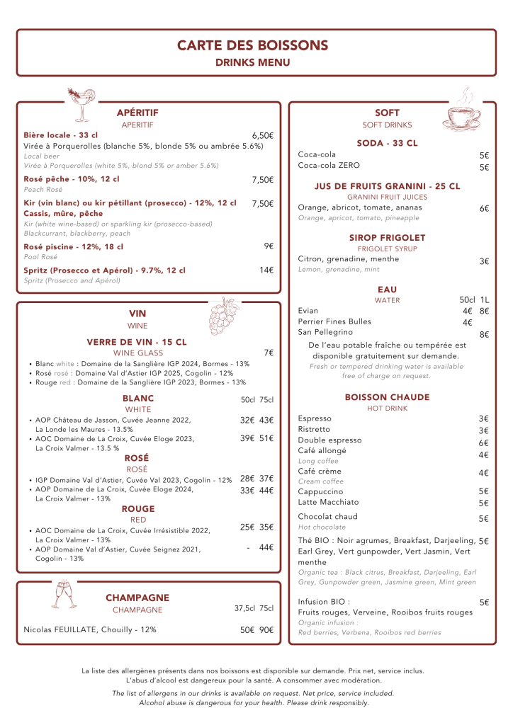 - Carte des boissons (de 10h30 à 21h)