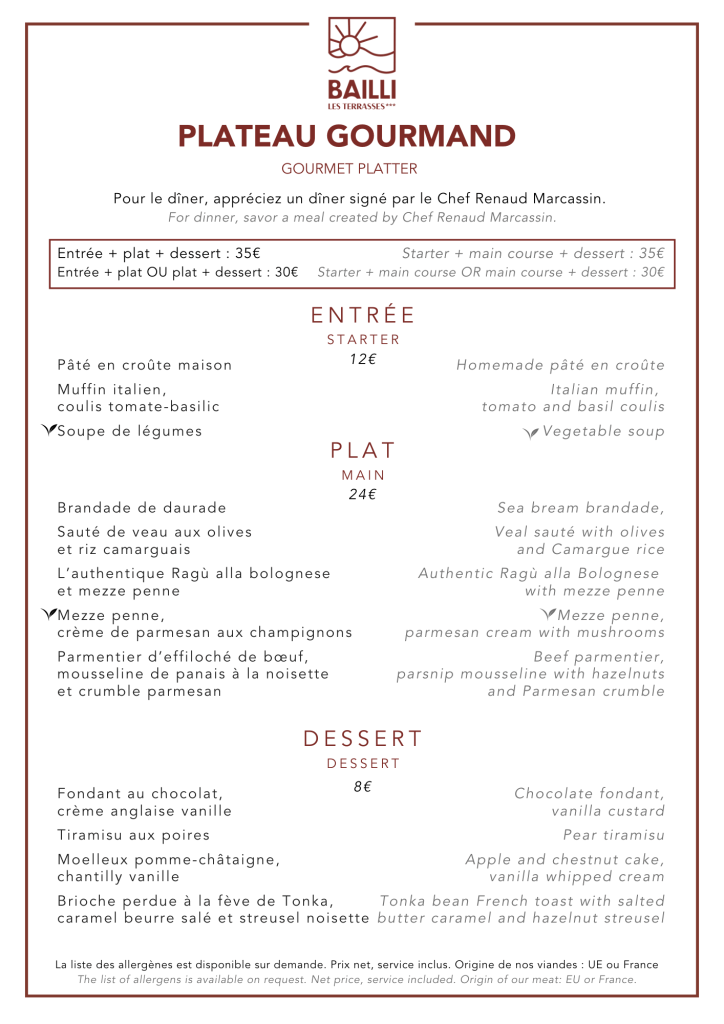 Déjeuner servi du 8 mai au 11 octobre 2025. Horaires : 12h30-15h.
