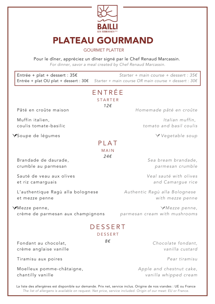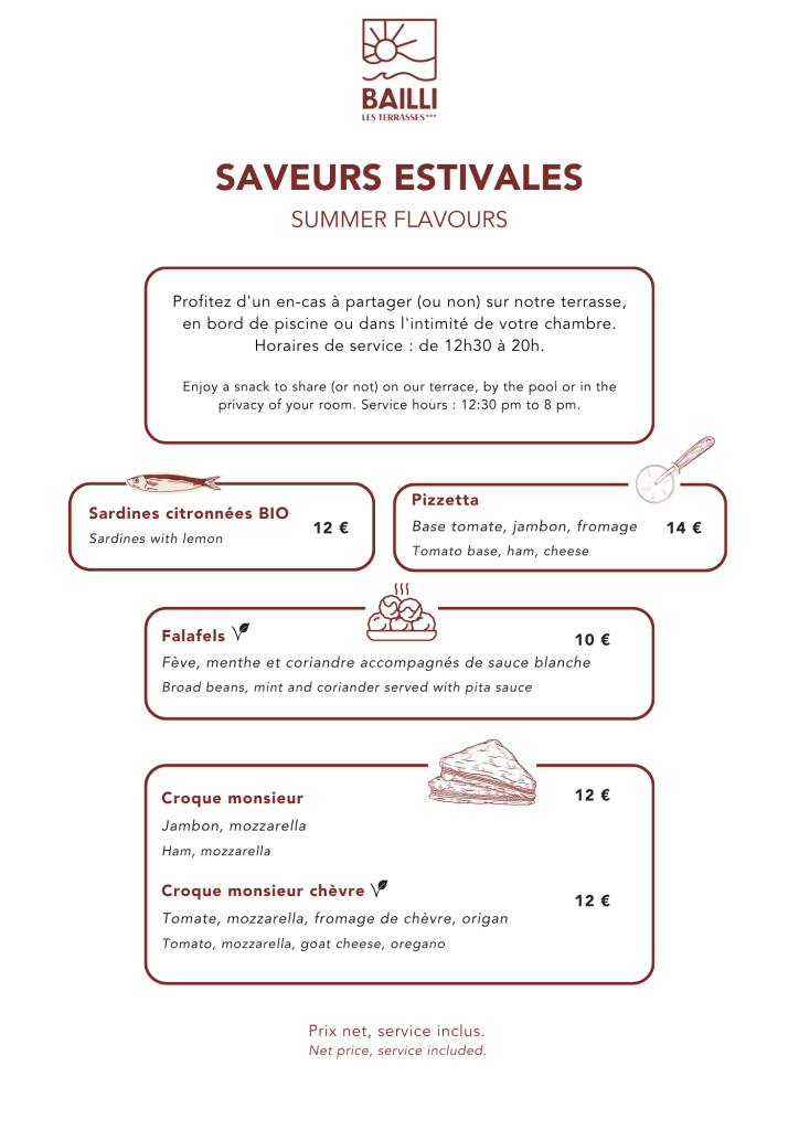 Déjeuner servi du 8 mai au 11 octobre 2025. Horaires : 12h30-15h.